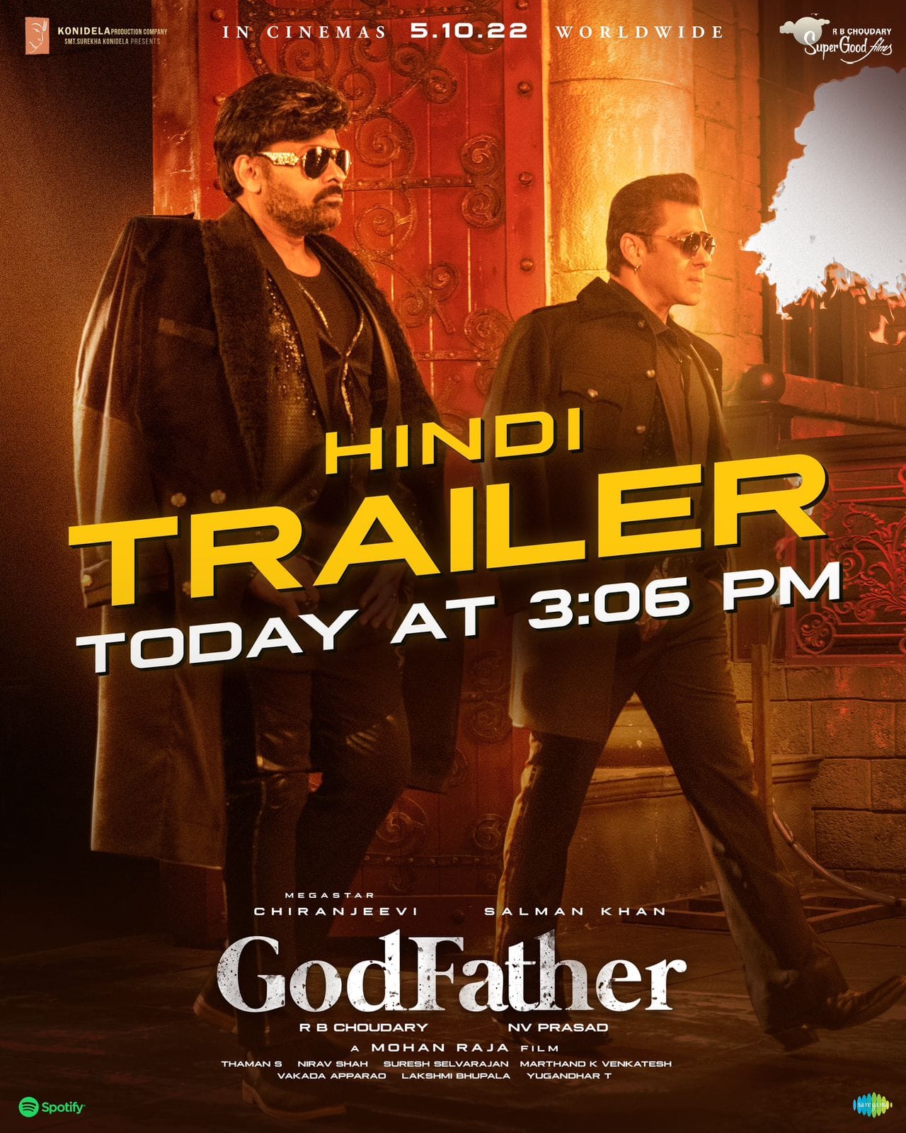 మూవీ కి మోహన్ రాజా దర్శకత్వం వహించగా , సన్సేషనల్ మ్యూజిక్ డైరెక్టర్ ఎస్ ఎస్ తమన్మూవీ కి సంగీతాన్ని అందించాడు. సల్మాన్ ఖాన్ ,  సత్య దేవ్ ,  నయన తారమూవీ లో ఇతర ముఖ్య పాత్రలలో నటించారు. ఇప్పటికే ఈ మూవీ విడుదల తేదీ దగ్గర పడడంతో ఈ మూవీ తెలుగు ట్రైలర్ ని కొన్ని రోజుల క్రితమే మూవీ యూనిట్ విడుదల చేసింది. మూవీ తెలుగు ట్రైలర్ కు ప్రేక్షకుల నుండి అద్భుతమైన రెస్పాన్స్ లభించింది. ఇది ఇలా ఉంటే గాడ్ ఫాదర్ మూవీ ని తెలుగు తో పాటు హిందీ లో కూడా విడుదల చేయనున్నారు. దానితో ఈ మూవీ యూనిట్ ఈ సినిమా హిందీ ట్రైలర్ విడుదలకు సంబంధించిన ఒక అదిరిపోయే అప్డేట్ తాజాగా విడుదల చేసింది. గాడ్ ఫాదర్ మూవీ హిందీ ట్రైలర్ ని ఈ రోజు మధ్యాహ్నం 3 గంటల 6 నిమిషాలకు విడుదల చేయనున్నట్లు మూవీ యూనిట్ అధికారికంగా ప్రకటిస్తూ ఒక పోస్టర్ ని కూడా విడుదల చేసింది. ఈ మూవీ లో బాలీవుడ్ స్టార్ హీరోలలో ఒకరు అయిన సల్మాన్ ఖాన్ కీలక పాత్రలో నటిస్తూ ఉండడంతో ,  ఈ మూవీ పై హిందీ సినీ ప్రేమికులు కూడా మంచి అంచనాలు పెట్టుకున్నారు.