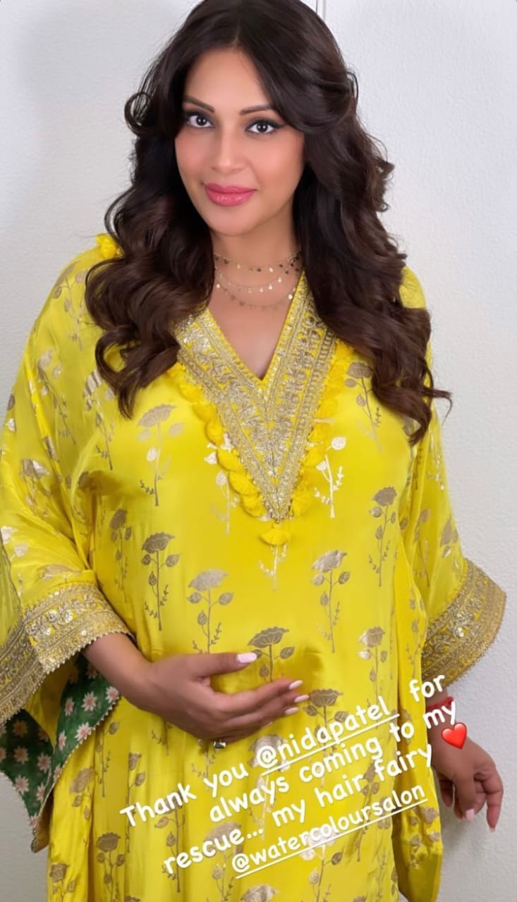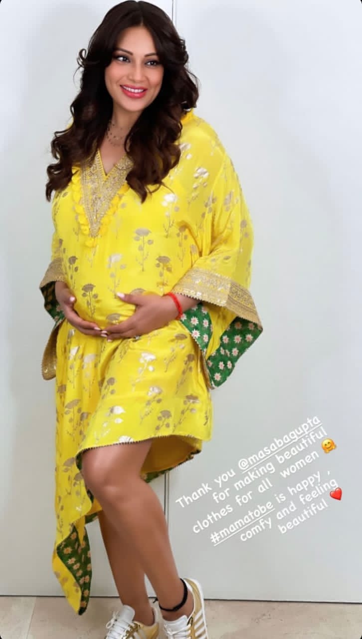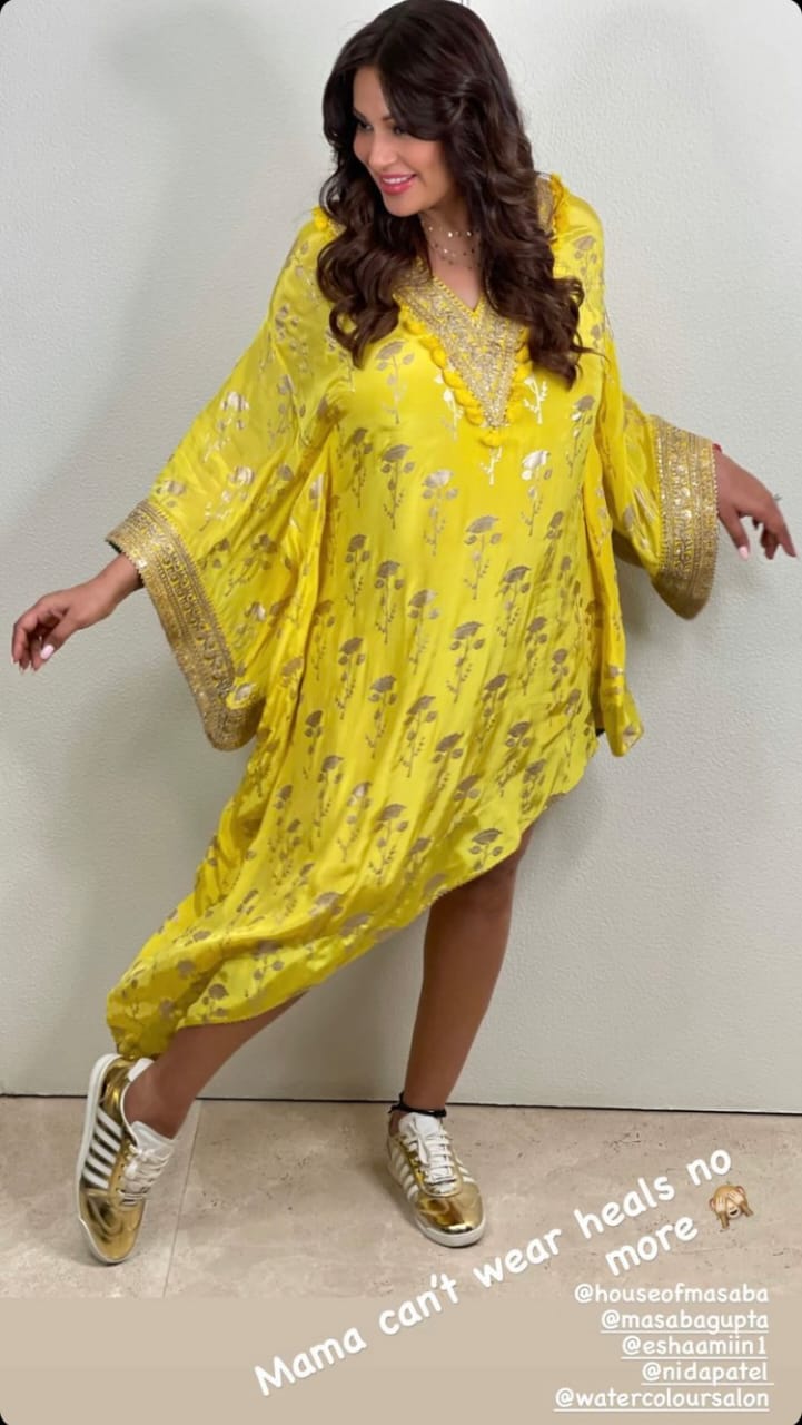 On 10 october 2022, he posted some of her happy pictures on her Instagram handle. Bipasha looked gorgeous dressed in a yellow silk dress which also featured a hemline. She paired it with three-tiered Stars gold jewelry and a pair of gold-toned sneakers. On top of the picture she wrote, "Mother can't wear heels anymore."