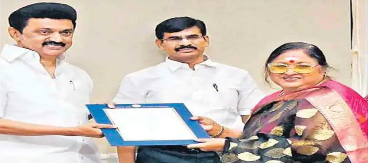 తమిళనాడు సీఎం స్టాలిన్ చేతులమీదగా భూమి పత్రాలు అందుకుంటున్న వాణిశ్రీ