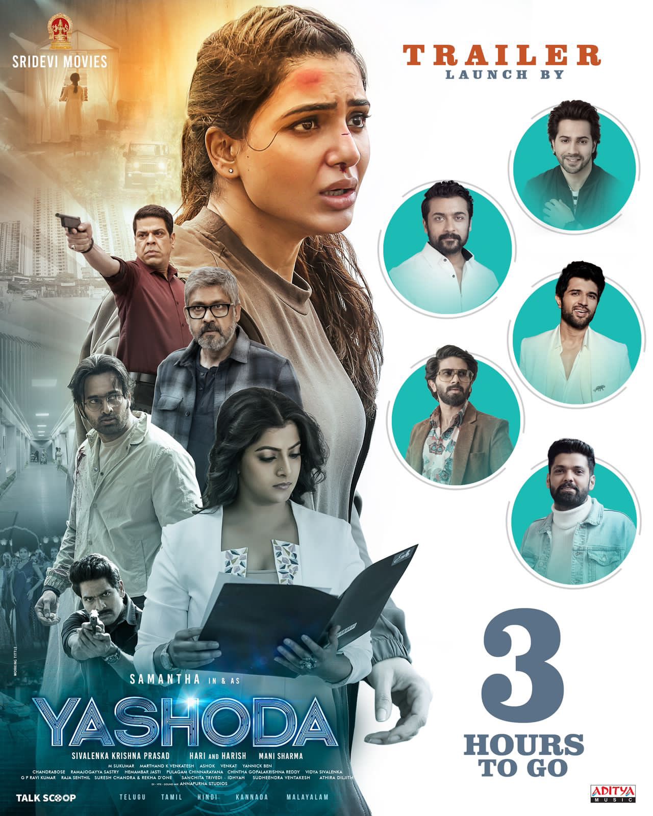 మూవీ తెలుగు ట్రైలర్ ను విజయ్ దేవరకొండ విడుదల చేయనుండగా ,  తమిళ్ ట్రైలర్ ను సూర్య విడుదల చేయనున్నాడు. మలయాళ ట్రైలర్ ను దుల్కర్ సల్మాన్ విడుదల చేయనుండగా ,  కన్నడ ట్రైలర్ ను రక్షిత్ శెట్టి విడుదల చేయనున్నాడు. హిందీ ట్రైలర్ ను వరుణ్ ధావన్ విడుదల చేయనున్నాడు. ఇలా సమంత ప్రధాన పాత్రలో తేరక్కెక్కిన యశోద మూవీ ట్రైలర్ ను 5 భాషలలో 5 అద్భుతమైన క్రేజ్ ఉన్న హీరోలు విడుదల చేయనున్నారు. మరి ఈ రోజు విడుదల కానున్న యశోద మూవీ ట్రైలర్ ప్రేక్షకులను ఏ మేరకు అలరిస్తుందో చూడాలి. ఈ క్రేజీ పాన్ ఇండియా మూవీ కి మణిశర్మ సంగీతాన్ని అందించాడు.