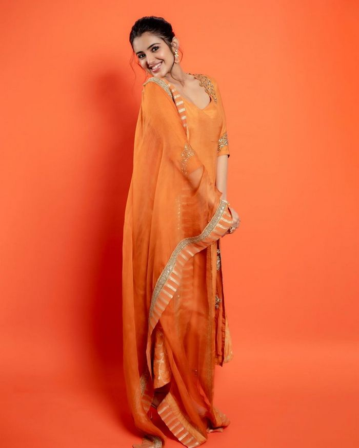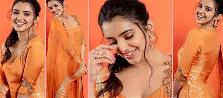 A beautiful object brings joy forever. And if the beauty beams with delight, that will never lose its allure. The director of red and Nela Ticket, malavika Sharma, is the newest star in Tollywood. She resembles an embodiment of an orange pearl in this attire. Her beautiful, shiny skin and beaming grin speak volumes about her feminine aura.