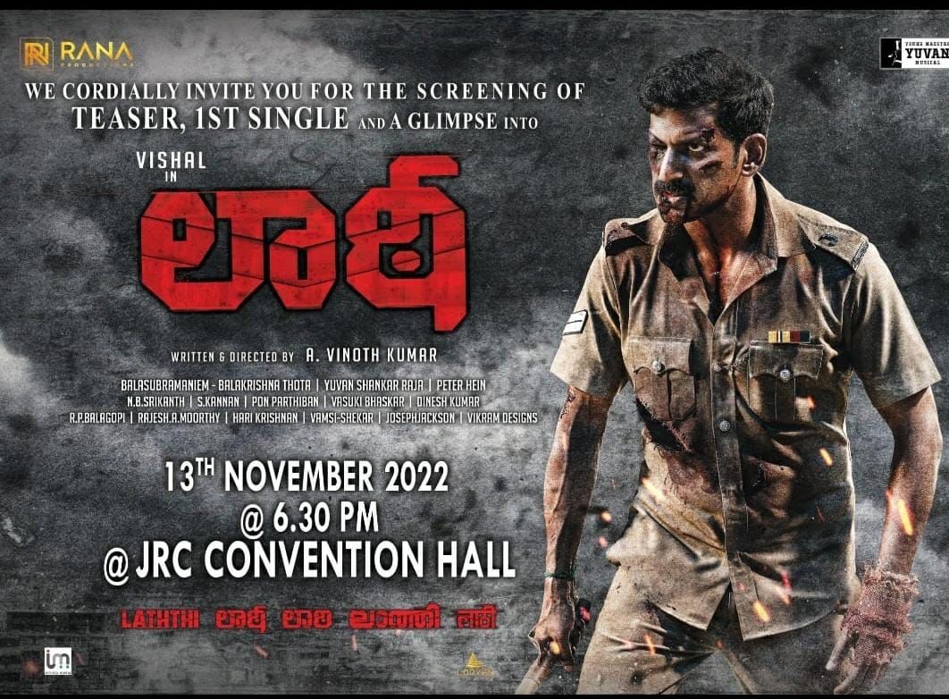 ఇది ఇలా ఉంటే తాజాగా విశాల్ "లాఠీ" అనే మూవీ లో హీరోగా నటిస్తున్న విషయం మనం అందరికీ తెలిసిందే. ఈ మూవీ లో విశాల్ పోలీస్ ఆఫీసర్ పాత్రలో కనిపించబోతున్నాడు. ఇప్పటికే ఈ మూవీ నుండి చిత్ర బృందం విడుదల చేసిన ప్రచార చిత్రాలకు ప్రేక్షకుల నుండి మంచి ఆదరణ లభించింది. ఇది ఇలా ఉంటే తాజాగా ఈ మూవీ యూనిట్ ఈ సినిమా నుండి ఒక అదిరిపోయి అప్డేట్ ను విడుదల చేసింది. ఈ మూవీ ఫస్ట్ గ్లిమ్స్ విడుదల ఈవెంట్ ను 13 నవంబర్ 2022 వ తేదీన "జే ఆర్ సి" కన్వెన్షన్ హాల్ లో  నిర్వహించనున్నట్లు మూవీ యూనిట్ తాజాగా ప్రకటిస్తూ ఒక పోస్టర్ ను కూడా విడుదల చేసింది. ప్రస్తుతం ఈ మూవీ యూనిట్ విడుదల చేసిన పోస్టర్ సోషల్ మీడియాలో వైరల్ అవుతుంది. ఈ మూవీ కి ఏ వినోద్ కుమార్ దర్శకత్వం వహిస్తున్నాడు.