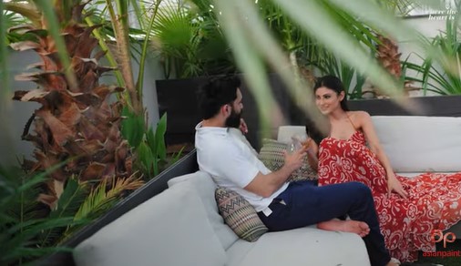 In the video, Mouni welcomes the audience in her large living room, behind which is a large tv screen. The wall decoration is also quite beautiful in the living room with beautiful lamps, cushions, and matching furniture. Behind the sofa is a round dining table with four chairs in a blue velvet fabric. A Sputnik-style chandelier hangs above it, which is quite attractive.