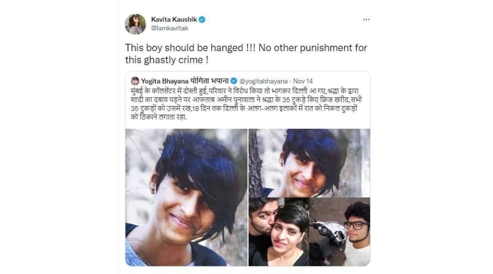 Kavita kaushik has recently posted about this case on her twitter account. Expressing his anger in this post, he has demanded a death sentence for the accused Aftab. Kavita wrote in her tweet- 'This boy should be hanged!!! There is no other punishment for this heinous crime. Kavita has also shared a tweet along with this post, in which the entire incident has been told.