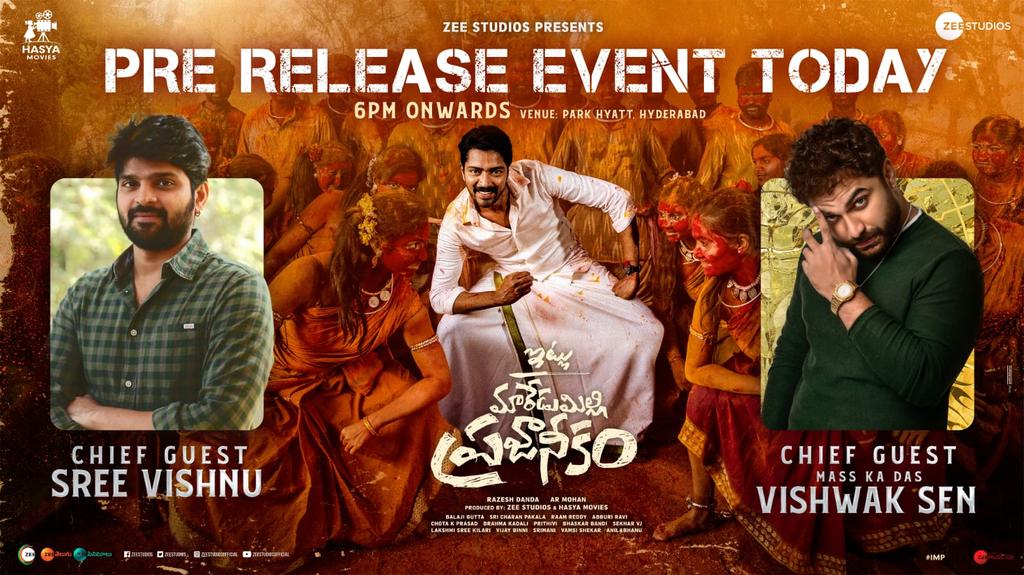 ఈ రోజు సాయంత్రం 6 గంటలకు పార్క్ హయత్ , హైదరాబాద్ లో ఈ మూవీ ఫ్రీ రిలీజ్ ఈవెంట్ ను నిర్వహించనున్నట్లు , ఈ మూవీ ఫ్రీ రిలీజ్ ఈవెంట్ కు టాలీవుడ్ ఇండస్ట్రీ లో యువ హీరోలు అయినటు వంటి శ్రీ విష్ణు మరియు విశ్వక్ సేన్ లు చీఫ్ గెస్ట్ లుగా విజయ్ నున్నట్లు చిత్ర బృందం అధికారికంగా ప్రకటిస్తూ  ఒక పోస్టర్ ను కూడా విడుదల చేసింది. ప్రస్తుతం ఈ పోస్టర్ సోషల్ మీడియాలో తెగ వైరల్ అవుతుంది.  ఇది ఇలా ఉంటే నాంది మూవీ విజయంతో ఫుల్ జోష్ లో ఉన్న అల్లరి నరేష్ "ఇట్లు మారేడుమిల్లి ప్రజానీకం" మూవీ తో ఏ రేంజ్ విజయాన్ని అందుకుంటాడో చూడాలి.