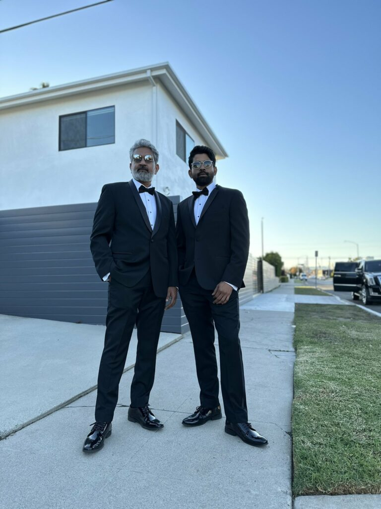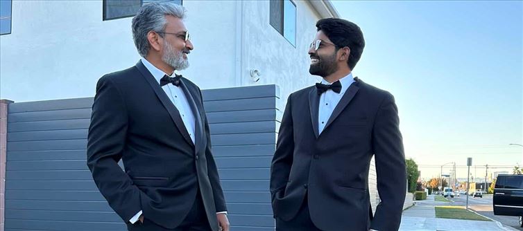 Rajamouli, who posed with his son SS Karthikeya, who is also wearing the same suit, is looking quite dashing in this highly english costume. He is wearing a simple glossy black tuxedo with a bow tie and dazzling formal shoes. They are rumoured to be in the united states right now, and they dressed up like this to attend an event. rajamouli looked magnificent while sporting those gleaming mirrored aviator glasses. His salt-and-pepper hairstyle added to the image, and we can't help but think he resembles a modern-day james Bond.