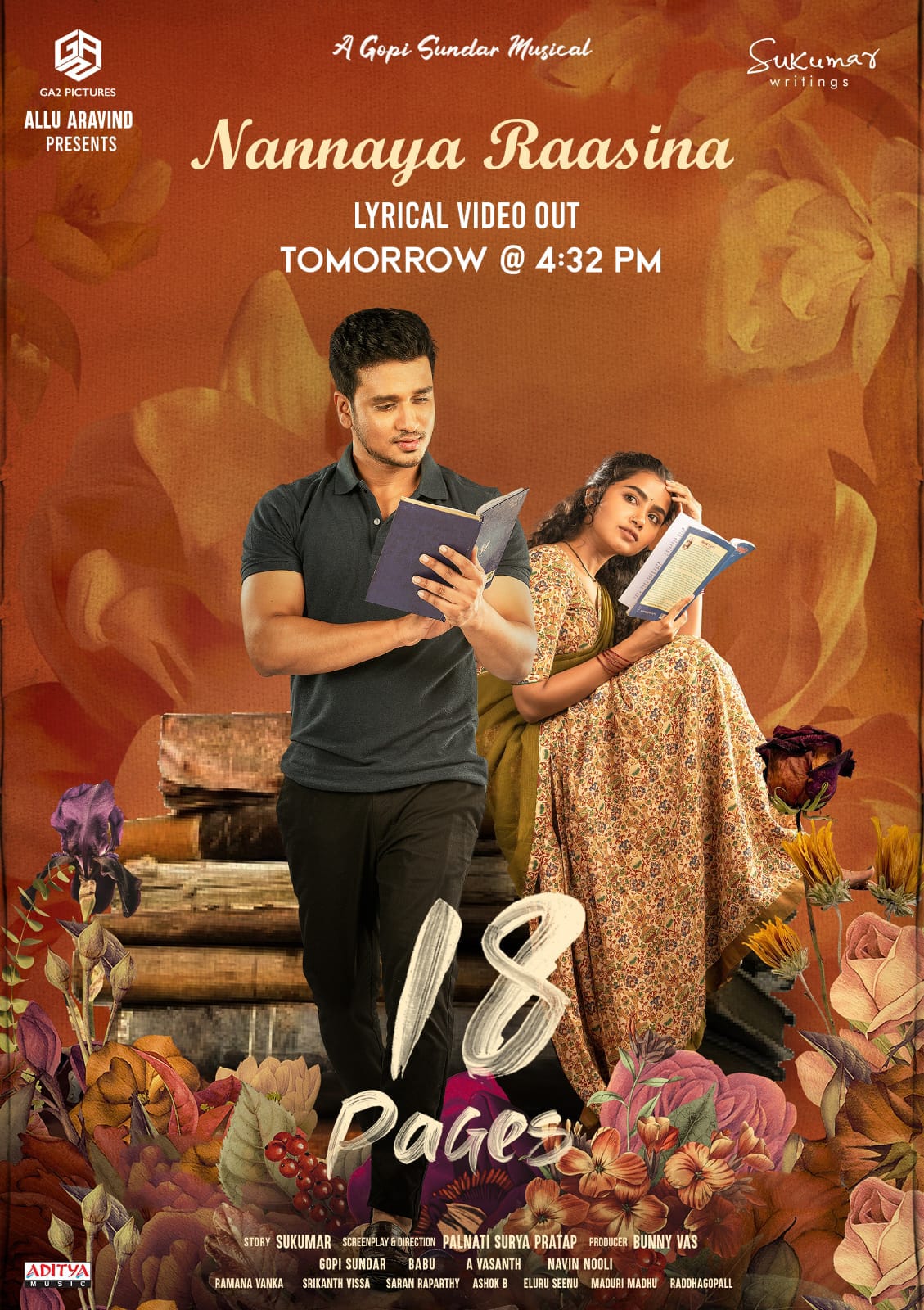 కొన్ని రోజుల క్రితమే 18 పేజెస్ మూవీ నుండి "నన్నయ్య రాసిన" అనే సాంగ్ ను నవంబర్ 22 వ తేదీన విడుదల చేయనున్నట్లు ఈ చిత్ర బృందం అధికారికంగా ప్రకటించింది. రేపు అనగా నవంబర్ 22 వ తేదీన "నన్నయ్య రాసిన" అనే సాంగ్ ను సాయంత్రం 4 గంటల 32 నిమిషాలకు విడుదల చేయనున్నట్లు చిత్ర బృందం అధికారికంగా ప్రకటిస్తూ ఒక పోస్టర్ ను కూడా విడుదల చేసింది. ప్రస్తుతం ఈ పోస్టర్ సోషల్ మీడియాలో వైరల్ అవుతుంది. ఈ సాంగ్ ఏ రేంజ్ లో ప్రేక్షకులను అలరిస్తుందో చూడాలి.