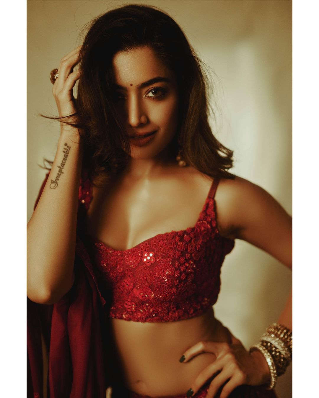 On the other hand, talking about makeup, rashmika has applied a small dot on her forehead with neutral tone makeup, in which she is looking very beautiful. This stunning look of rashmika is very special even in the price, which you will also be surprised to hear. Yes, this lehenga of the perfect monotone look for the wedding season will not fit in everyone's budget, because this red lehenga from 'MISHRU' brand is 4,50,000.