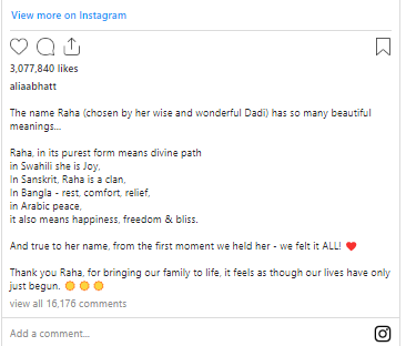 In this case, alia bhatt has posted on instagram about the name they have given to her baby girl and its meaning. She named her child Raha. She also said that this name was chosen by Ranbir Kapoor's mother Neetu Kapoor. she said that the baby's name is 'Raha' in her instagram post which has many beautiful meanings. It was chosen by the child's wise and wonderful grandmother. Raha meant a divine path which is the purest form. In Swahili, it means happiness, in sanskrit Raha is a clan, in Bangla - Respite, consolation, and removal of grief. In Arabic, peace. Also means exaltation, happiness, freedom, and bliss.All this applies to her. All these they felt the moment they picked her up. Thank you Raha for bringing their family back to life, it feels like their lives have just begun. alia bhatt will soon be seen in hollywood in heart of Stone. Apart from this, alia has several films lined up. alia has released 4 films this year alone. RRR, Gangubai, Brahmastra, Darlings, and other films were released. Darlings were released directly on Netflix and co-produced by alia Bhatt.