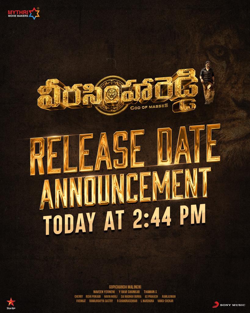 కాకపోతే ఇప్పటి వరకు ఈ మూవీ విడుదల తేదీని ఈ చిత్ర బృందం ప్రకటించ లేదు. ఇది ఇలా ఉంటే తాజాగా ఈ మూవీ విడుదల తేదీకి సంబంధించిన అధికారిక ప్రకటనను వీర సింహా రెడ్డి మూవీ యూనిట్ ప్రకటించింది. తాజాగా ఈ మూవీ యూనిట్ ఈ సినిమా విడుదల తేదీని ఈ రోజు మధ్యాహ్నం 2 గంటల 44 నిమిషాలకు విడుదల చేయనున్నట్లు అధికారికంగా ప్రకటిస్తూ ఒక పోస్టర్ ను కూడా విడుదల చేసింది. ఈ సినిమా విడుదల తేదీ కోసం బాలకృష్ణ అభిమానులు చాలా రోజుల నుండి చాలా ఆసక్తిగా ఎదురుచూస్తున్నారు. ఇది ఇలా ఉంటే ఇప్పటికే ఈ మూవీ నుండి చిత్ర బృందం విడుదల చేసిన ప్రచార చిత్రాలు అద్భుతమైన రీతిలో ఉండడంతో , ఈ మూవీ పై బాలకృష్ణ అభిమానులు భారీ అంచనాలు పెట్టుకున్నారు.