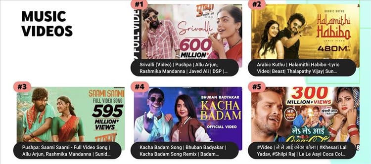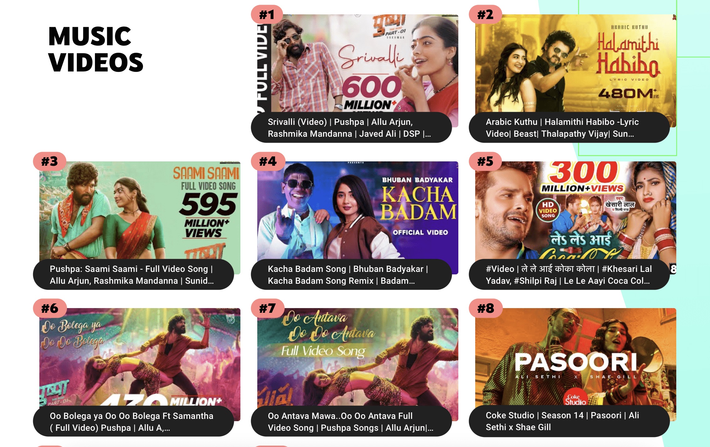 Huge numbers of people have viewed the hindi versions of pushpa songs; the top two songs are Srivalli (544 million views) and Saami Saami (490 million views). And with 344 million views, Oo Antava's hindi version is in sixth place, while the telugu version is seventh. The second-placed Arabic Kuthu Lyrical Video, Kacha Badam, fourth-placed Arabic Kuthu video song, and others are among the list's top performers. Another surprise for the hindi music scene is that not a single bollywood song made it into the Top 10 YouTube playlists for 2022.