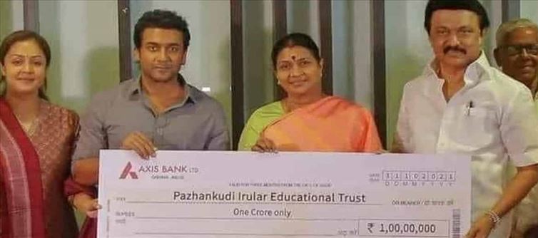 Actor Suriya and his wife Jyothika have once again displayed their humanitarian side by helping underprivileged kids attend school. A husband and wife team gave Rs 1 crore from the gross of their movie "Jai Bheem" for the upbringing of tribal children's education. Suriya and his wife may be seen handing MK Stalin, the chief minister of tamil Nadu, the check-in a picture that was shared on Social media.