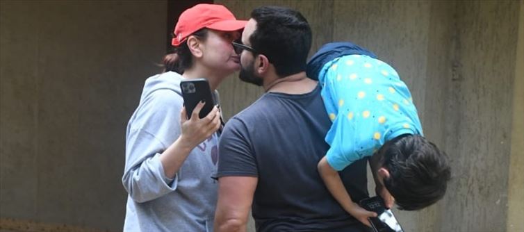 One of Bollywood's prettiest couples is ali KHAN' target='_blank' title='saif ali khan-Latest Updates, Photos, Videos are a click away, CLICK NOW'>saif ali khan and kareena kapoor Khan. Setting objectives as a couple is a strength for these two. We have evidence that the spark is still present even after almost ten years of marriage and two gorgeous children. As usual, the paparazzi made sure to take pictures of the nawabs when they were seen today directly beneath their building. Our attention was drawn to the couple's adorable lip kiss as their older kid Taimur rested on his father's shoulder.