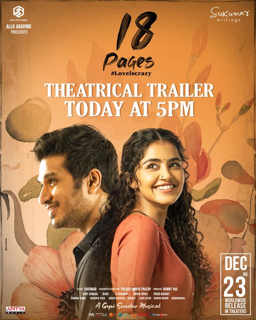 తాజాగా నిఖిల్ "18 పేజీస్" అనే మూవీ లో హీరో గా నటించాడు. ఈ మూవీ లో కూడా నిఖిల్ సరసన అనుపమ పరమేశ్వరన్ హీరోయిన్ గా నటించింది. పల్నాటి సూర్య ప్రతాప్మూవీ కి దర్శకత్వం వహించాడు. ఈ మూవీ ని డిసెంబర్ 23 వ తేదీన విడుదల చేయనున్నారు. ఈ మూవీ విడుదల తేదీ దగ్గర పడడంతో ఈ మూవీ యూనిట్ తాజాగా ఈ సినిమాకు సంబంధించిన అదిరిపోయే అప్డేట్ ను ప్రకటించింది. ఈ మూవీ ట్రైలర్ ను ఈ రోజు అనగా డిసెంబర్ 17 వ తేదీన సాయంత్రం 5 గంటలకు విడుదల చేయనున్నట్లు ఈ మూవీ యూనిట్ తాజాగా అధికారికంగా ప్రకటిస్తూ ఒక పోస్టర్ ను కూడా విడుదల చేసింది. ఈ సినిమా ట్రైలర్ ప్రేక్షకులను ఏ మేరకు ఆకట్టుకుంటుందో చూడాలి.