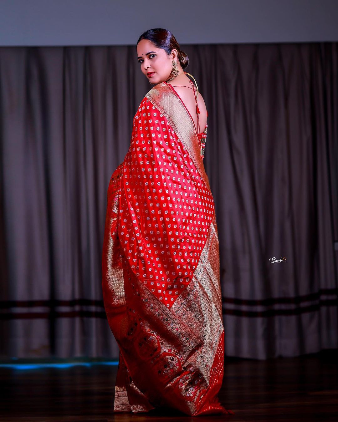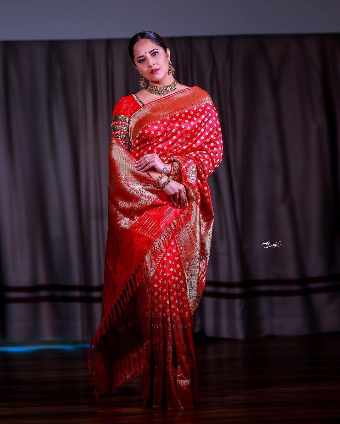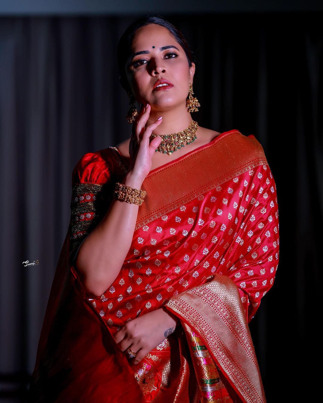 అందులో భాగంగా తాజాగా యాంకర్ కం నటి అయినటు వంటి అనసూయ అదిరిపోయే లుక్ లో ఉన్న రెడ్ కలర్ శారీని కట్టుకొని అందుకు తగిన రెడ్ కలర్ లో ఉన్న బ్లౌజ్ ను ధరించి అదిరిపోయే యాంగిల్స్ లో ఫోటోలకు స్టిల్స్ ఇచ్చింది . ప్రస్తుతం అనసూయ కు సంబంధించిన ఈ ఫోటోలు సోషల్ మీడియాలో వైరల్ అవుతున్నాయి .