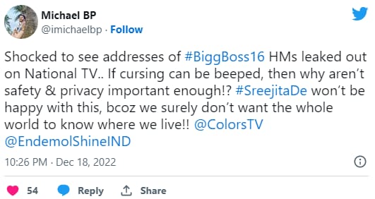 Vikas Manaktala and Tina Dutta opened up about her bonding with Sreejita Dey. Talking about the same, he had leaked Sreejitha's home address in mumbai on national television. The actress was later reprimanded by Sreejita's fiance Michael Blohm, who bought a new flat with her. Expressing his displeasure over the same, he also slammed the makers of 'Bigg Boss 16' for not muting that part. She wrote on her twitter handle, "Shocked to see #BiggBoss16 HM address leaked on National TV. If abuses can be beeped, why isn't security and privacy enough!? #SreejitaDe will not be happy about this, because We certainly don't want the whole world to know where we live!!"