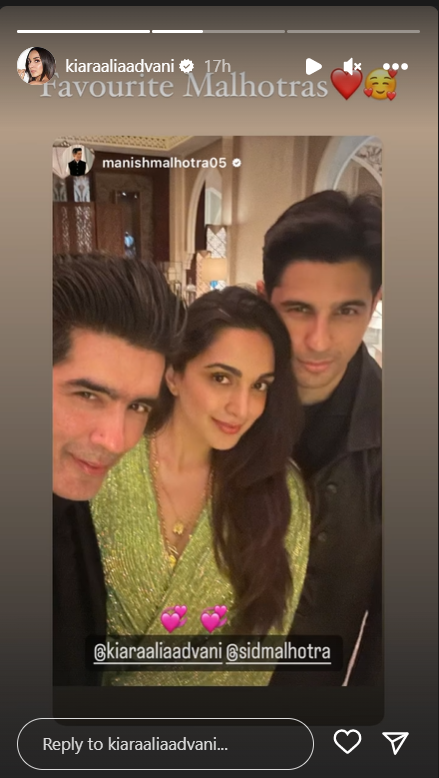 The actress reposted the manish Malhotra-originally posted image on her instagram story with the comment "Favorite Malhotras." Initially, manish Malhotra posted a picture on instagram with sidharth malhotra, karan johar, and kiara in black, with the remark, "Wishing you all a wonderful New Year." kiara could be seen looking lovely in a green sparkly dress.