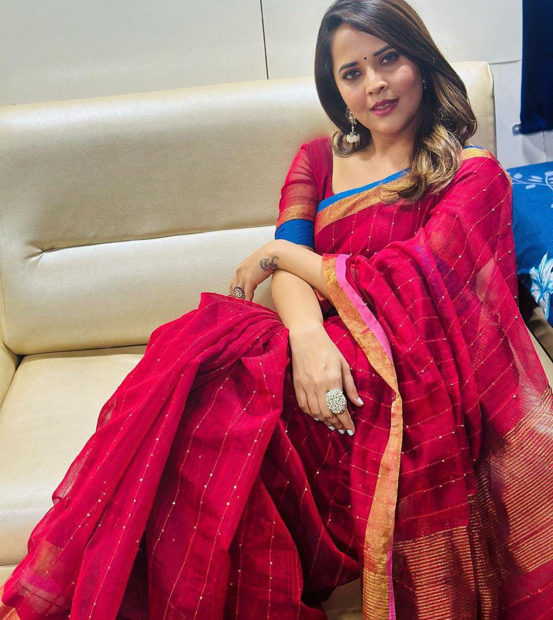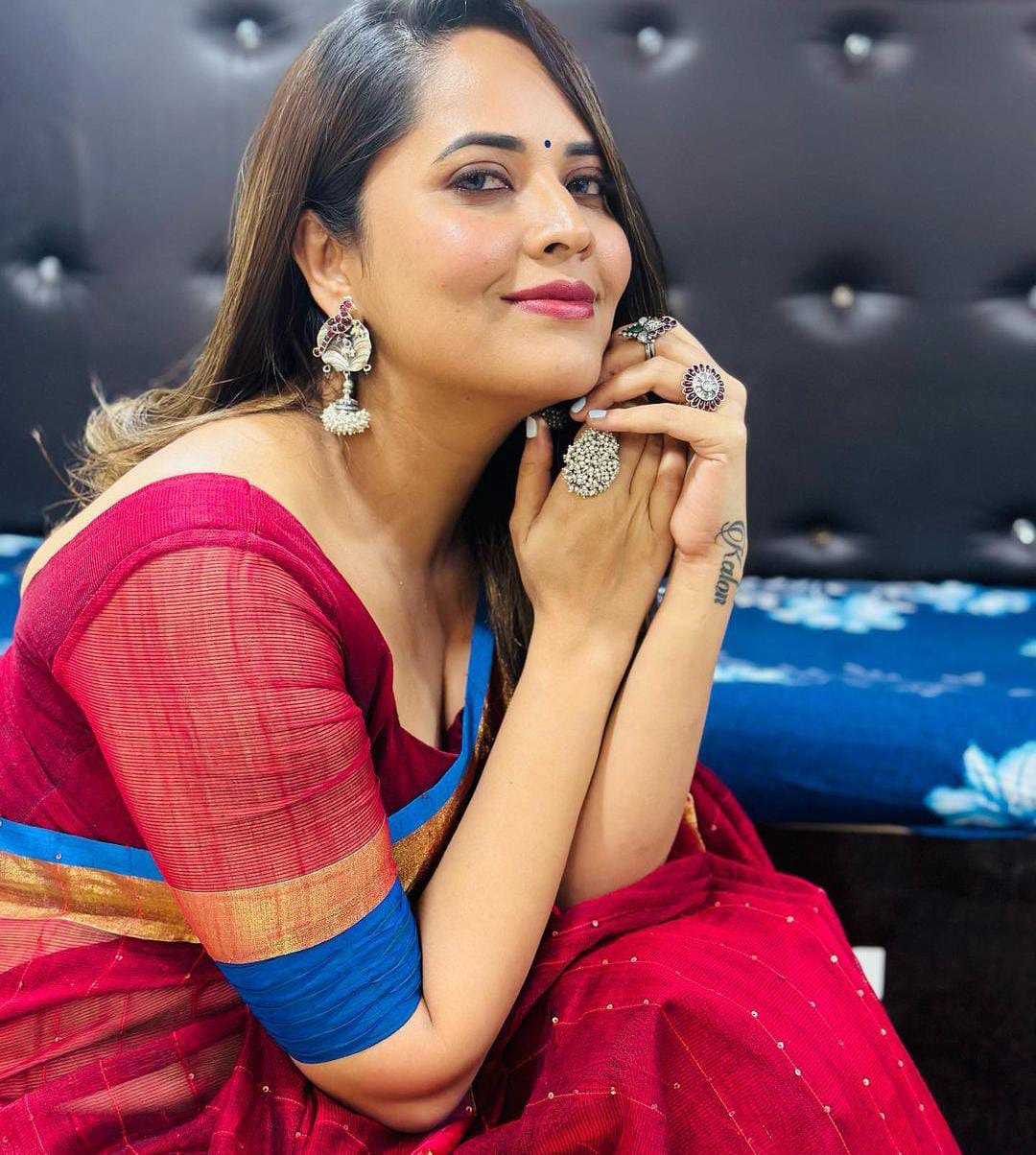 ఇది ఇలా ఉంటే ఇప్పటికే పాన్ ఇండియా రేంజ్ లో నటిగా గుర్తింపును సంపాదించుకున్న ఈ ముద్దుగుమ్మ అప్పుడప్పుడు సోషల్ మీడియాలో కూడా తనకు సంబంధించిన ఫోటోలను పోస్ట్ చేస్తూ కుర్రకాలను కవ్విస్తూ ఉంటుంది. అందులో భాగంగా తాజాగా అనసూయ అదిరిపోయే లుక్ లో ఉన్న మెరూన్ కలర్ శారీని కట్టుకొని ... అందుకు తగిన మెరూన్  మరియు బ్లూ కలర్ కాంబినేషన్ లో ఉన్న బ్లౌజ్ ను ధరించి అదిరిపోయే యాంగిల్స్ లో ఫోటోలకు స్టిల్స్ ఇచ్చింది. ప్రస్తుతం అనసూయ కు సంబంధించిన ఈ ఫోటోలు సోషల్ మీడియాలో వైరల్ అవుతున్నాయి.
