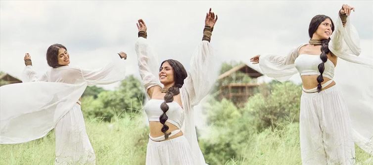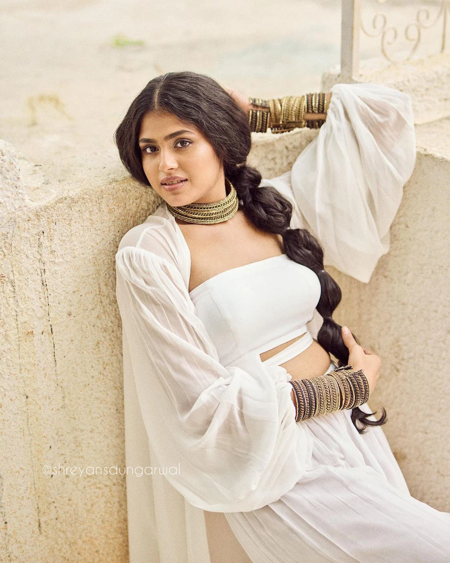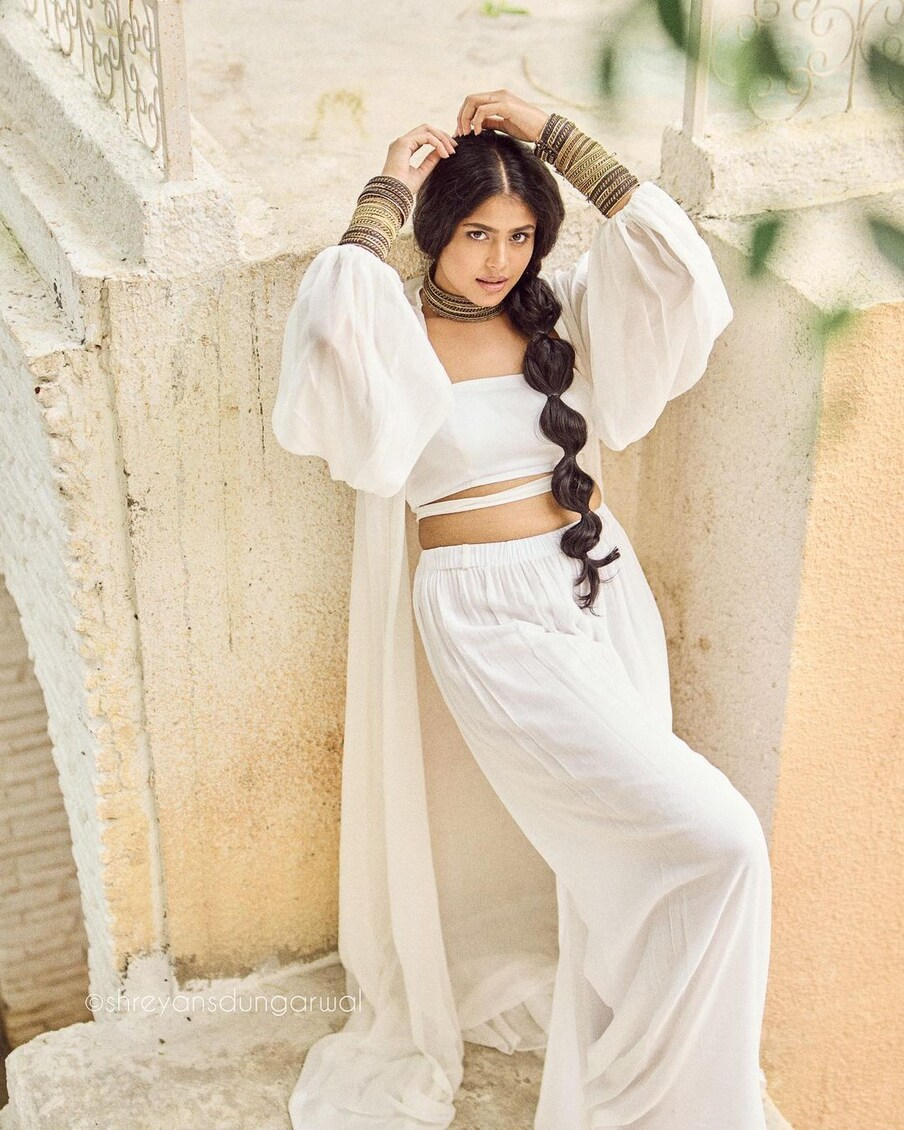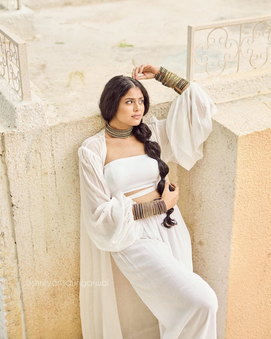 heroine jati Ratnalu "became like a washed jewel." Faria Abdullah participated in a picture shoot while wearing a complete white outfit and several hairstyles. She smiled mischievously as she posed for pictures, as if saying, "Look at me. Look at my skin."