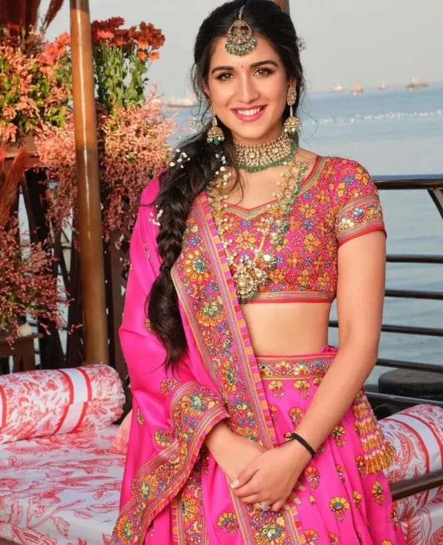 A video of Radhika's mehendi function is going viral on social media, in which radhika Merchant was seen dancing her heart out to alia Bhatt's song 'Ghar More Pardesiya'. Radhika, the soon-to-be daughter-in-law of the Ambani clan, won everyone's hearts with her scintillating dance moves and looks on the mehendi night. radhika looked stunning in her entire look, wearing a fuchsia pink floral embroidered lehenga. She complemented her look with a polki choker necklace, matching earrings, maang-tika, and a long necklace.