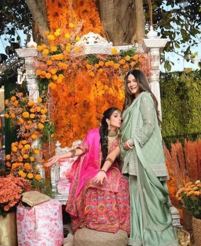 A beautiful picture of radhika Merchant's mehendi ceremony has been shared by a fan page of the Ambani family. In this picture, radhika is seen kissing her pregnant sister anjali Merchant's baby bump while posing. In the picture, anjali can be seen standing next to Radhika, pampering her younger sister. anjali wore a heavy sea-green satin suit with a matching dupatta for her sister's mehendi ceremony, in which the mother-to-be looked drop-dead gorgeous.