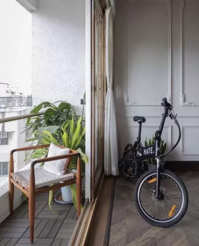 Wooden work has been done on the balcony of alia and Ranbir. The balcony is decorated with some beautiful plants and chairs. There is also a cycle next to the balcony.