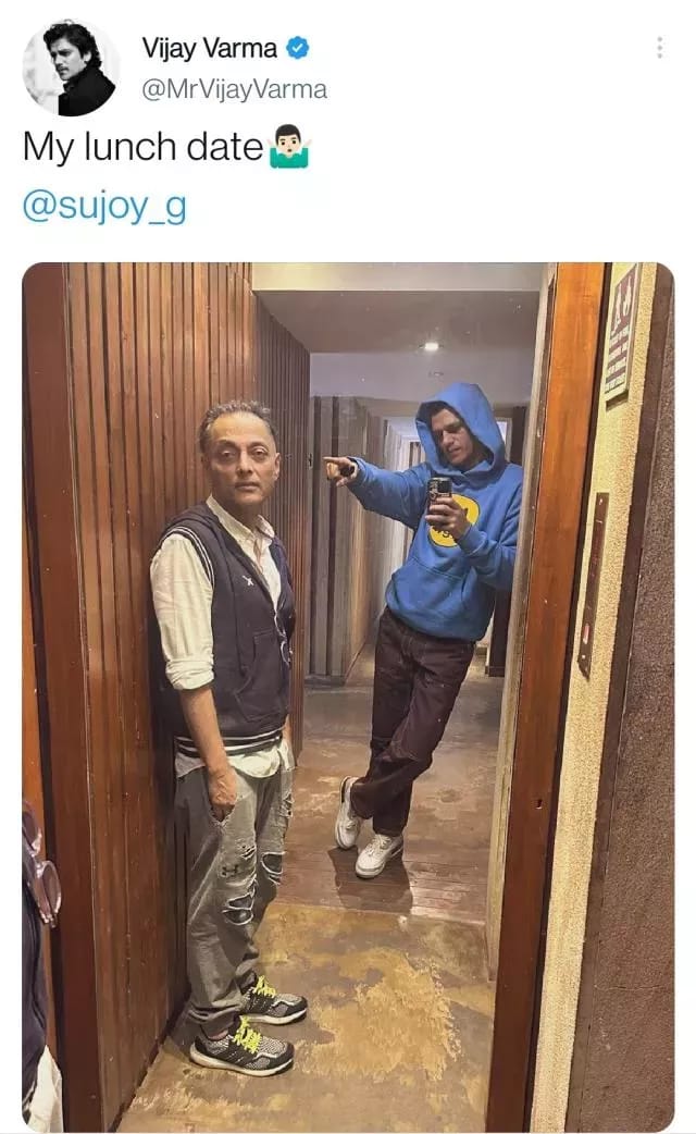 For a long time, bollywood actor vijay varma has been in the headlines for his relationship with South actress tamannaah Bhatia. Rumors of their affair surfaced when both were seen celebrating New Year at a restaurant in goa on the occasion of New Year. Recently, the actor took to his twitter handle to share a picture of their lunch date, which is going viral on social media. Amidst all the rumors of dating Tamanna, vijay varma shared a picture of his 'lunch date' on his twitter handle on 17 january 2023, in which he was seen with filmmaker Sujoy Ghosh. While Sujoy wore a white shirt with gray joggers for the lunch date, Vijay was seen in a blue hoodie and brown pants.