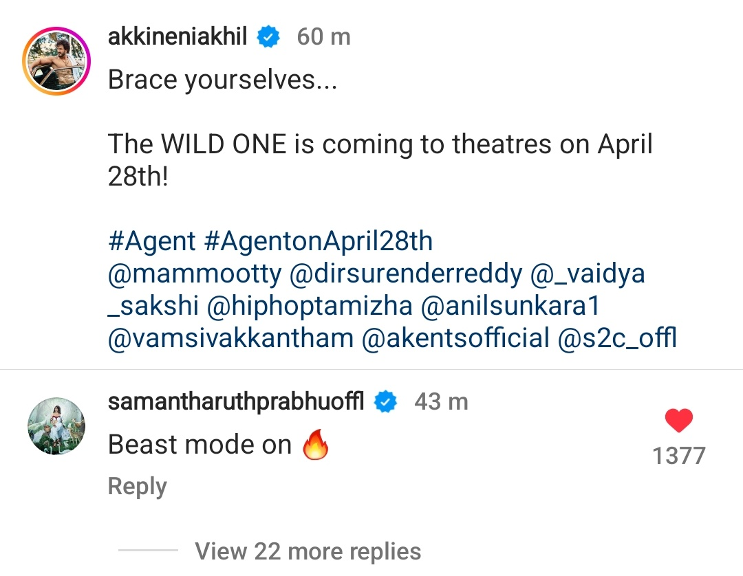 By showing kindness to naga Chaitanya's ex-brother wife's akhil Akkineni, samantha Ruth Prabhu is currently earning hearts. She wished him well with the upcoming film Agent's release in his comment area. The actress sent akhil her love and support for Agent. samantha Ruth Prabhu posted a message of congratulations in the comment section when akhil akkineni revealed a new promo video to reveal the precise release date for Agent. Beast mode on (with fire emoticons)," she wrote. On april 28, samantha Ruth Prabhu's birthday, Agent will debut in all South Asian languages.
