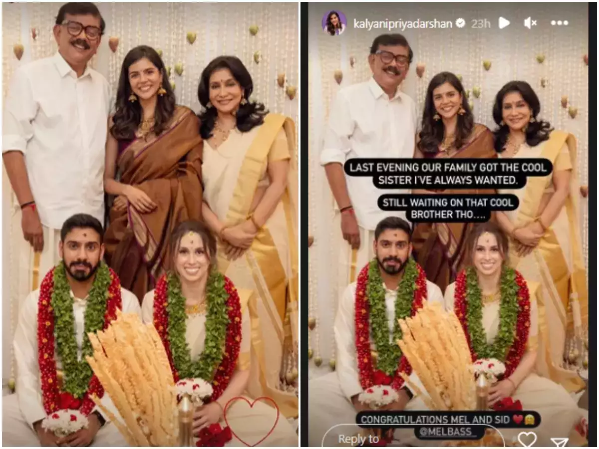 Siddharth, the son of renowned director priyadarshan and actress lissy Lakshmi, wed on february 3 in a small ceremony. Kalyani priyadarshan, an actress who plays Siddharth's sister, wrote a heartfelt statement to welcome Melanie, her sister-in-law. priyadarshan -Latest Updates, Photos, Videos are a click away, CLICK NOW'>kalyani priyadarshan expressed her desire for a "cool sister" when sharing a photo from her brother's wedding on her instagram page.