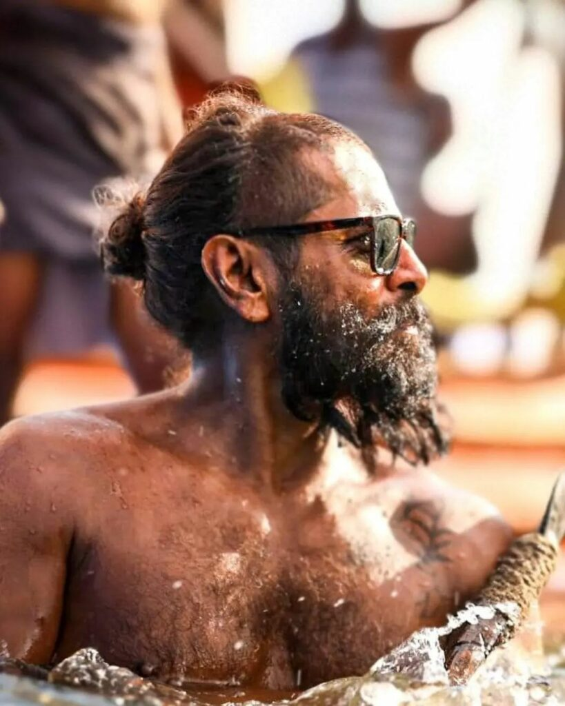 With his shirtless pictures shared, Chiyaan vikram has completely taken over the internet. He recently started filming again for "Thangalaan," flaunting his amazing physique and chic eyewear. The images of him sporting a beard and a man bun have his followers in a frenzy.