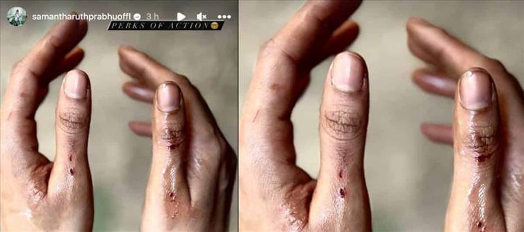 Today, samantha displayed what occurs when you overindulge in action-related activities on her instagram stories. She tweeted a photo of her hands with the caption "Perks of Action," highlighting the obvious bruises on her palms. In action scenes, performers typically use body doubles, but it appears that Samantha's desire to deliver the badass stuff herself led to these wounds.