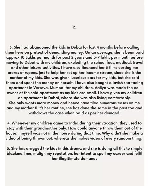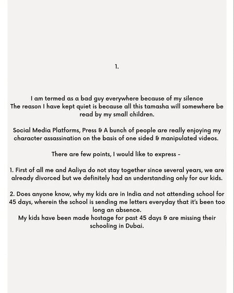 He shared a long note on instagram and wrote pointers on what is going on. His note read, “I am being told as a bad man everywhere because of my silence. I have kept calm because all this tamasha will be read by my little kids somewhere.” Writing in pointers, he said, "First of all me and alia have not lived together for many years, we are already divorced, but we had an understanding only for our children." He also said, "Does anyone know, why my kids are in india and not going to school for 45 days, in which the school is sending me letters every day saying that they are absent for a very long time? My kid was last Held hostage for 45 days and missing his schooling in Dubai."
