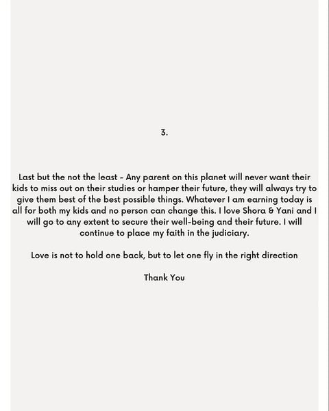 She further added, "She only wants more money and hence has filed several cases against me and my mother and this is her routine, she has done the same in the past and when the demand is met, she withdraws the case." Is." Talking about the recent video, he wrote, “Whenever my kids came to india during their vacation, they used to stay with their grandmother. How can anyone throw them out of the house? I was not in the house during that time. Why didn't she make a throwout video when she makes videos of everything? He has drawn the children into this drama." He wrote, "No parent would ever want their children to miss out on their studies or become a hindrance to their future, they would always try to give the best possible things they can. Whatever I am earning today, is all for my children and no one can change that. I love Shora and Yani and I would go to any length to secure their well-being and their future. I have won all the cases so far and will continue to have faith in the judiciary. love is not about holding one back, but letting one fly in the right direction. Thank you."