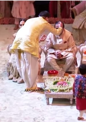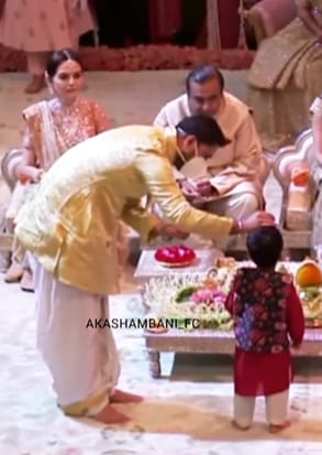 Mukesh Ambani signals to Pandit to vaccinate grandson. In the video, we can see that as soon as Pandit ji moves forward to vaccinate mukesh, he gestures to his grandson prithvi to vaccinate him first. After this, the pundits vaccinate prithvi and then later Mukesh. During this, where mukesh is seen in a golden color kurta and white pajama and golden color jacket, the little prince is looking very cute in a red kurta and white pajama with printed jacket.