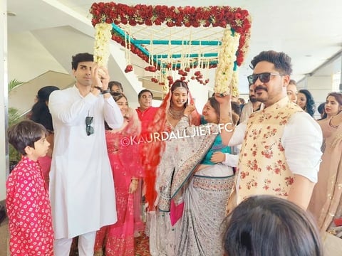 Dalljiet's son Jaden held his mother's hand. While Diljiet was walking down the aisle, Akshay Dogra was seen holding a corner of the flowered bedspread. Barun Sobti and Sunayana Fozdar were also seen from Diljit's side.