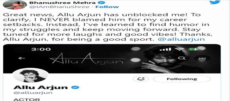 നടിയുടെ കരിയർ നശിക്കാൻ കാരണം അല്ലു അർജുന്റെ ചിത്രമാണെന്നാണ് താരം ഉദ്ദേശിച്ചത് എന്ന് പറഞ്ഞായിരുന്നു ആരാധകരുടെ ആക്രമണം. ഇതിന് പിന്നാലെ മറ്റൊരു ട്വീറ്റുമായി നടി വീണ്ടുമെത്തി.അല്ലു അർജുൻ തന്നെ അൺബ്ലോക്ക് ചെയ്തു എന്നായിരുന്നു താരം പറഞ്ഞത്. അല്ലു അർജുൻ എന്നെ അൺബ്ലോക്ക് ചെയ്തു! എന്റെ കരിയറിലെ തിരിച്ചടികൾക്ക് ഞാൻ ഒരിക്കലും അദ്ദേഹത്തെ കുറ്റപ്പെടുത്തിയിട്ടില്ലെന്നും ഭാനുശ്രീ കുറിച്ചിട്ടുണ്ട്. വരുഡുവിന് ശേഷം ഭാനുശ്രീ നിരവധി ചിത്രങ്ങളിൽ അഭിനയിച്ചെങ്കിലും കരിയറിൽ മുന്നേറാൻ താരത്തിന് കഴിഞ്ഞില്ല. 2021 ൽ പുറത്തിറങ്ങിയ മറോ പ്രസ്ഥാനം എന്ന ചിത്രത്തിലാണ് ഭാനുശ്രീ ഒടുവിൽ അഭിനയിച്ചത്. ഇപ്പോൾ യൂട്യൂബ് വ്ലോഗറാണ് ഭാനുശ്രീ. യാത്രകൾ, ലൈഫ്സ്റ്റൈൽ, പാചകം തുടങ്ങിയവയെല്ലാം ഭാനുശ്രീ യൂട്യൂബിലൂടെ അവതരിപ്പിക്കുന്നുണ്ട്. തെലുങ്ക്, തമിഴ്, പഞ്ചാബി സിനിമകളിൽ തിളങ്ങുന്ന നടിമാരിലൊരാളാണ് ഭാനുശ്രീ മെഹ്റ (bhanushree mehra).