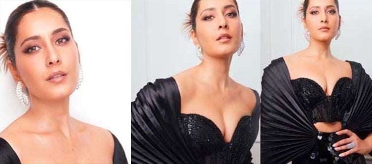 The adored actress Raashi Khanna easily captivates audiences with her alluring appearance and inherent charisma. She is adamant about keeping herself physically active and working to improve her abilities. It's difficult to express how stunning Raashi Khanna appears in this specific outfit. She is dressed in a glistening black ensemble with a broad neckline that highlights her feminine appeal and makes her incredibly alluring.