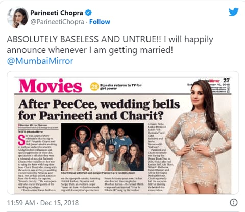 It was soon claimed in the media reports that after Priyanka, Parineeti is also going to tie the knot with Charit soon. However, she denied all these reports with a tweet from her twitter handle, which read, "Absolutely baseless and untrue!! Whenever I get married, I will happily announce it! @MumbaiMirror."