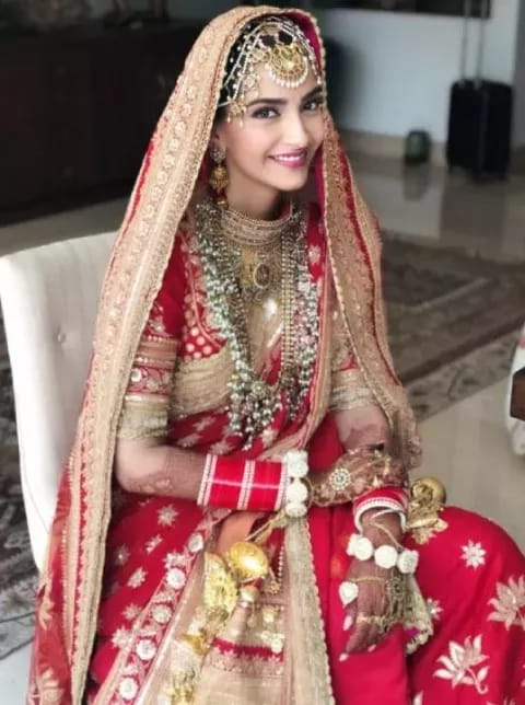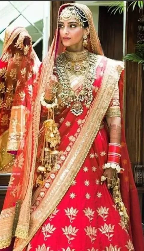 Sonam Kapoor's wedding look in Anuradha Vakil's dreamy lehenga-choli. sonam kapoor tied the knot with the love of her life, anand Ahuja, on 8 May 2018. For her wedding, Sonam wore a red lehenga from the collection of famous designer Anuradha Vakil. Sonam's wedding dress was truly heirloom worthy and took almost six months to complete.