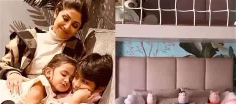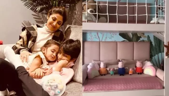 In fact, on 10 april 2023, shilpa shetty shared a video from her insta handle showing her daughter Samisha's new room. The beautiful room features jungle-themed wallpaper, featuring elephants, giraffes, monkeys, and other animals. The room also has a double-decker bed with stairs attached to one side and a cushion at the bottom adorned with Peppa Pig soft toys.