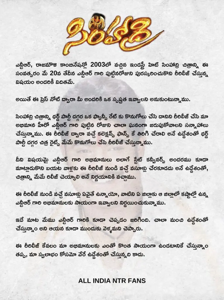 success of Pokiri, Okkadu, Jalsa, and Kushi. Simhadri's re-release on May 20th, the day of NTR's birthday, has lately received official confirmation.