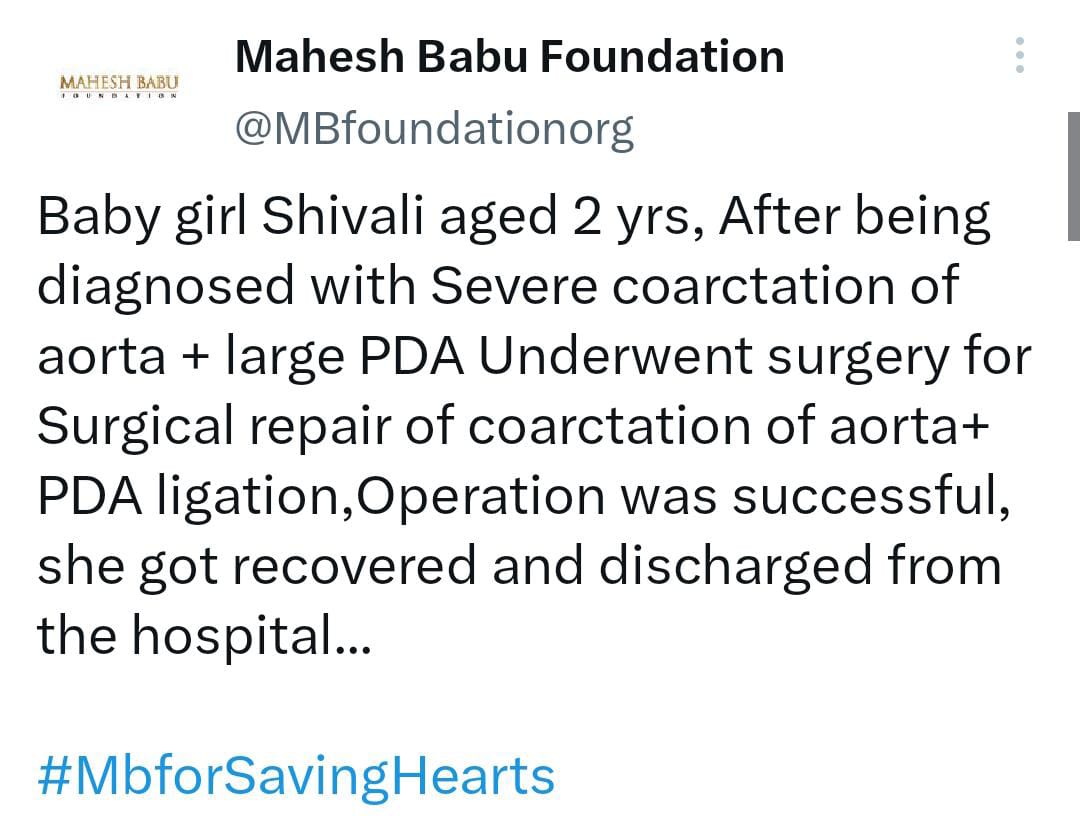 అందు లో భాగం గా ఇప్పటికే ఎంతో మంది చిన్నారు లకు గుండె ఆపరేషన్ లను చేయించి వారికి కొత్త జీవితా లను ఇచ్చాడు . తాజాగా కూడా మహేష్ ఒక చిన్నారికి శస్త్ర చికిత్సను చేయించి కొత్త జీవితాన్ని అందించాడు . తాజాగా మహేష్ తన ఫౌండేషన్ మీద శివాలి అనే రెండేళ్ల వయసు గల చిన్నారికి గుండె శస్త్ర చికిత్స నిర్వహించారు.  ఆ శస్త్ర చికిత్స విజయవంతం అవడంతో ఈ పాప ఇప్పటికే డిశ్చార్జ్ అయ్యి ఇంటికి వెళ్లిపోయింది .