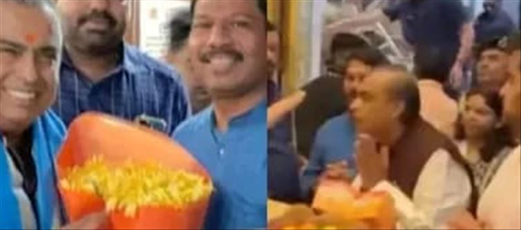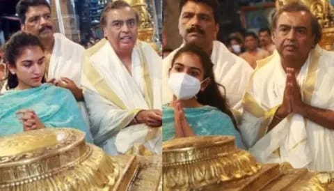 Last year, mukesh ambani visited Guruvayur sri krishna temple in Kerala. He was dressed in a cream-colored dhoti with a shawl. He was accompanied by his future daughter-in-law radhika Merchant. She was dressed in a blue bandhani suit. She completed her look by tying her hair in a ponytail and bindi. mukesh ambani donated Rs 1.5 crore to the temple for Annadanam (food for the devotees).