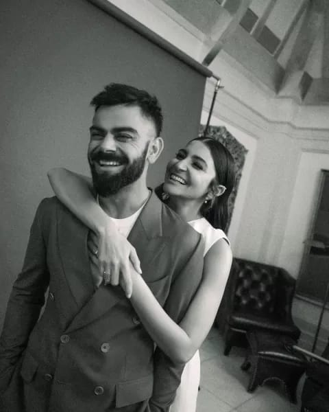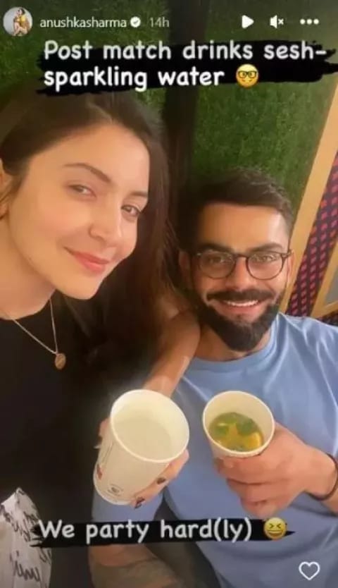 On 16 april 2023, anushka and Virat were seen celebrating RCB's victory after a match. anushka shared a cute picture with her husband Virat on her instagram story. In the picture, the actress revealed how she celebrated RCB's win. The two looked adorable as they held the glasses in their hands and posed for the cameras. anushka looked drop-dead gorgeous in a black outfit while Virat complemented her in a blue T-shirt.