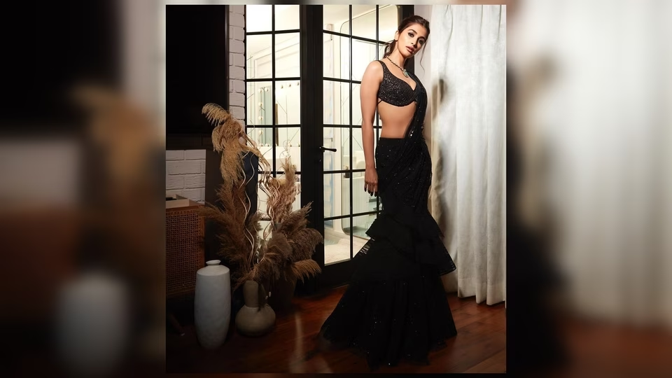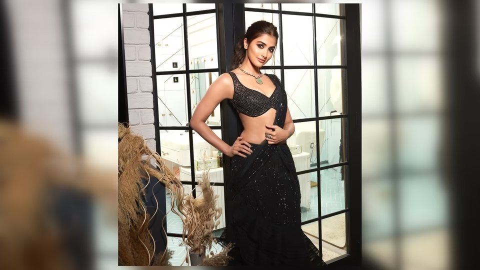 Black silhouettes are beautiful in and of themselves, thus they can only appear more beautiful when arranged into a saree. Black sarees are always a show-stopper, and now we can see that pooja hegde knows just how to increase her style quotient by utilising their unrivalled allure. The actress chose a specially crafted black saree from Jade by monica and Karishma, styling by Ami Patel. pooja is no stranger to sophisticated drapes when it comes to classic suits.