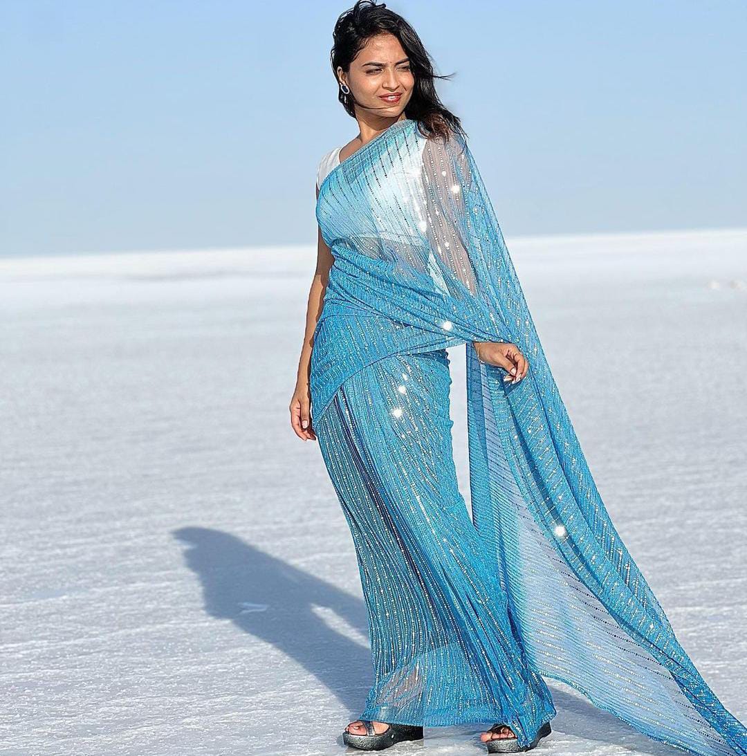 తాజాగా ఈ బ్యూటీ తన సోషల్ మీడియా అకౌంట్ లో కొన్ని ఫోటోలను పోస్ట్ చేసింది. తాజాగా తన సోషల్ మీడియా అకౌంట్ లో పోస్ట్ చేసిన ఫోటోలను హారిక స్కై బ్లూ కలర్ లో ఉన్న పలుచటి శారీ ని కట్టుకొని ... వైట్ కలర్ లో ఉన్న స్లీవ్ లెస్ బ్లౌజ్ ను ధరించి అదిరిపోయే యాంగిల్స్ లో ఫోటోలకు స్టిల్స్ ఇచ్చింది. ప్రస్తుతం హారిక కు సంబంధించిన ఈ ఫోటోలు సోషల్ మీడియాలో ఫుల్ వైరల్ అవుతున్నాయి.