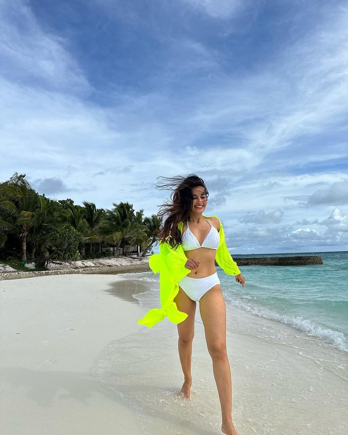 The stunning 35-year-old actress Surbhi Jyoti is well known for her captivating beauty and standout performances in a number of indie films. However, it was her part in the well-known tv series "Qubool Hai" that really demonstrated her acting talent and brought in the prizes. Surbhi recently attracted attention when she showed up in a gorgeous swimsuit combination that was complemented with a vivid yellow apron that was elegantly slung over her shoulder.