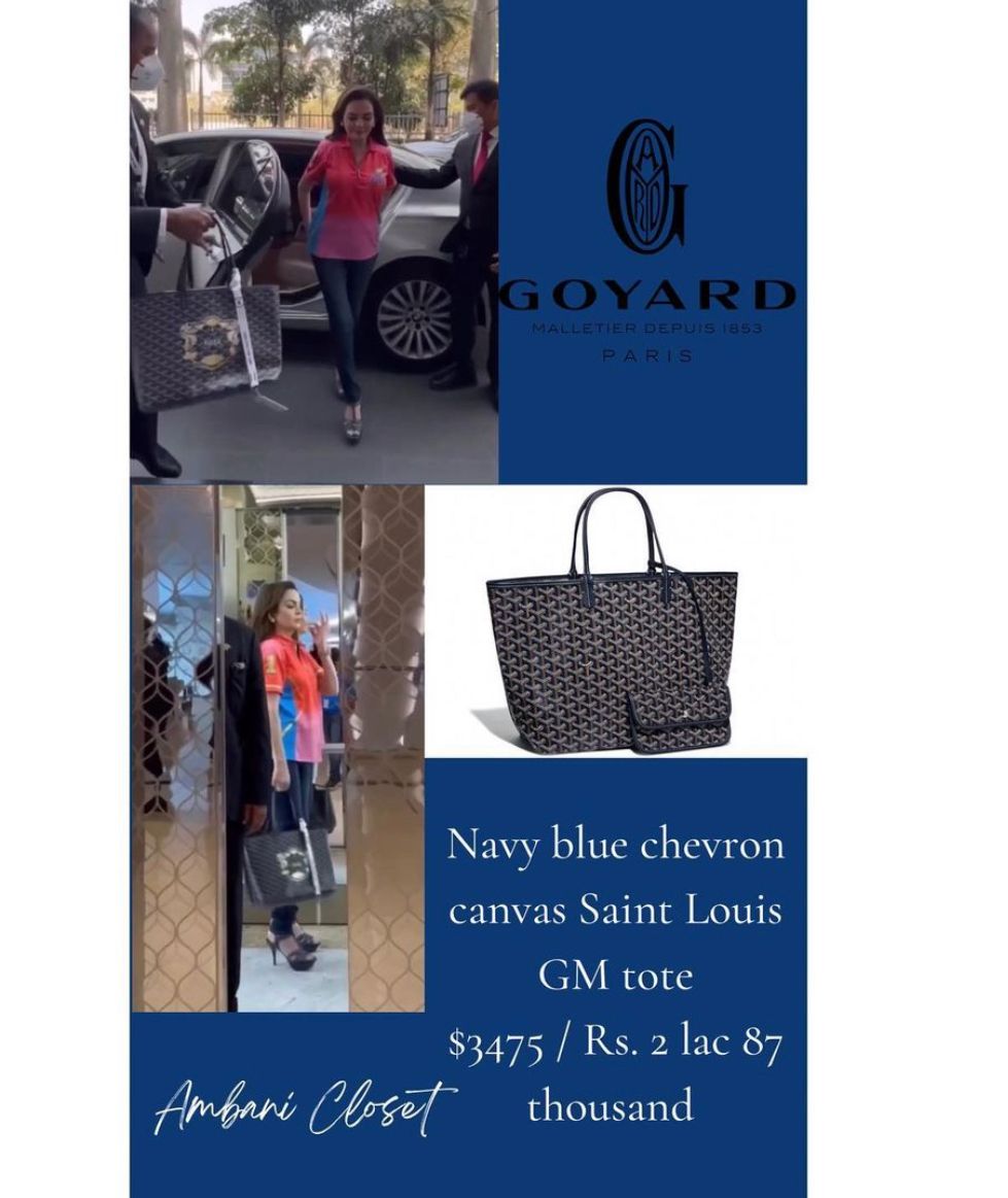 For an auction ceremony of mumbai Indians, Nita was spotted wearing a special edition multi-colored mumbai Indians jersey paired with black denim jeans. Nita accessorized her look with a navy blue-hued chevron canvas bag from Saint Louis. Adorned with gold accents, the tote bag also has Nita Ambani's name monogrammed on it. Nita's GM tote bag costs a whopping sum of USD 3475, which converts to Rs. 2 lakhs and 87 thousand in indian currency.