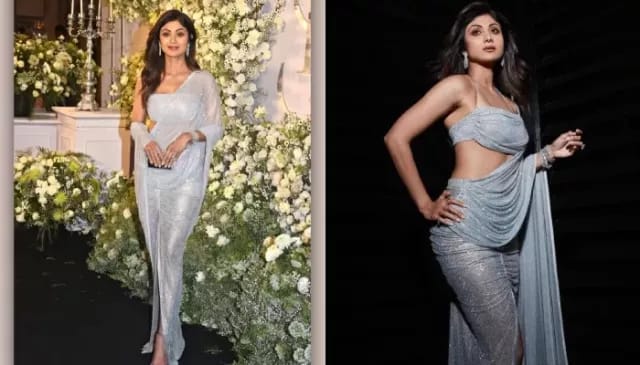 Shilpa stunned everyone with her hot look at kiara and Siddharth's wedding reception. shilpa had chosen a silver pre-draped saree for the party, which had a pallu and thigh-high slit. She paired it with a strappy halter-neck blouse. shilpa kept her look minimal with statement earrings. Subtle makeup with bouncy hair completed her look.