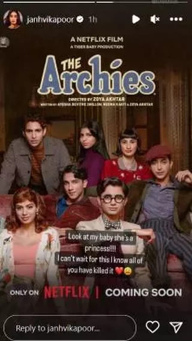 Meanwhile, the makers of 'The Archies' have unveiled a new poster of the film, out on june 12, 2023, which shows the cast posing around a sofa. She was seen sporting a retro look and Khushi looked drop-dead gorgeous in a peach-layered top paired with an off-white cardigan and a checkered skirt. Janhvi reacted to the poster and showered love on Khushi Kapoor. Sharing the poster on his instagram story, he called her a 'princess' and wrote, "Look at my baby girl she is a princess!!!! I can't wait for this I know you all kill it ''